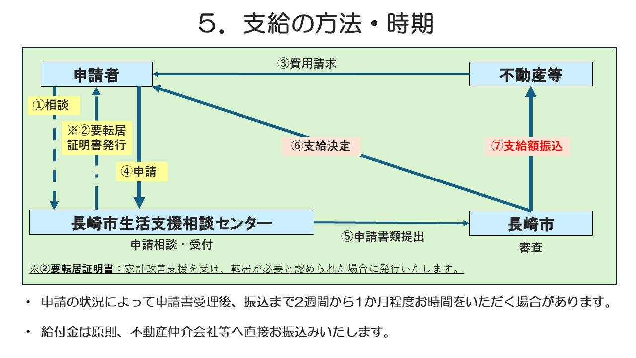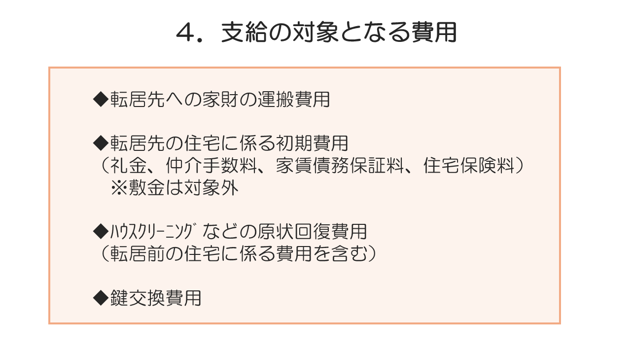 長崎市生活支援相談センター 住居確保給付金(転居費用の補助) 令和7年4月からこれまでの住居確保給付金(家賃給付)に加え、転居費用の給付も可能になりました。 ★詳しくはこちらをご覧ください。 1,住居確保給付金(転居費用補助) しおり 2,住居確保給付金(転居費用補助) チェック表